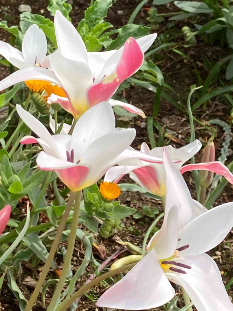 散歩道沿いの庭園で、白い花弁の真ん中にピンク色の縦スジが入っている可愛い花を見つけました。「チューリップ・レディージェーン」でしょうか。ユリ科チューリップ属で、原産地はアフガニスタンやイラン、パキスタンなど中東地域。