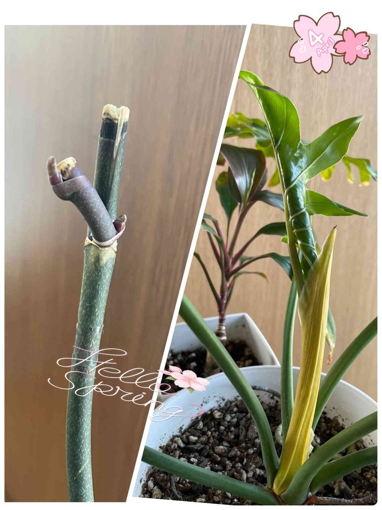 茎が出ていたのに折れてしまって諦めていた胡蝶蘭にまた新しい芽、茎が伸びてきました‼︎しかも二つ❣️ うれしい😂
