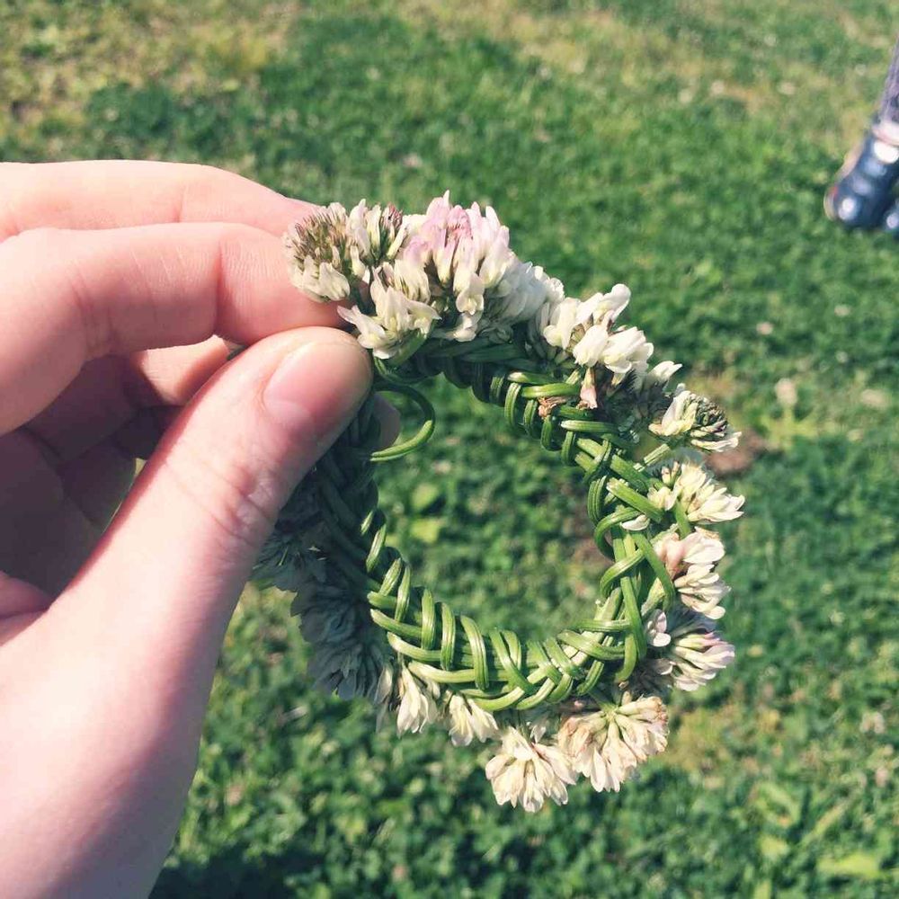 パパと息子がサッカーしてる間にシロツメクサで冠編んだよ。気付いたらお花摘むの手伝ってくれてた(^^)平和♡