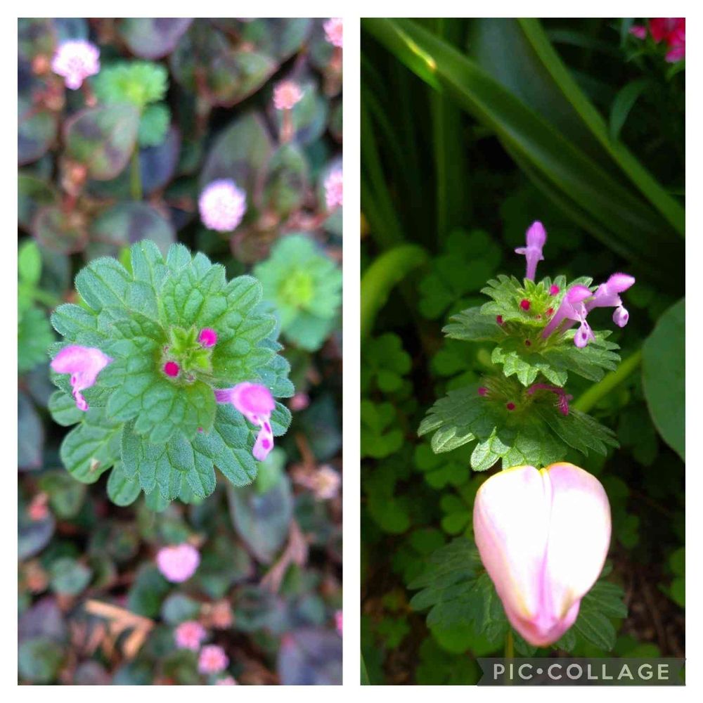 左、我が家の塀横、ヒメツルソバの上に咲くホトケノザ