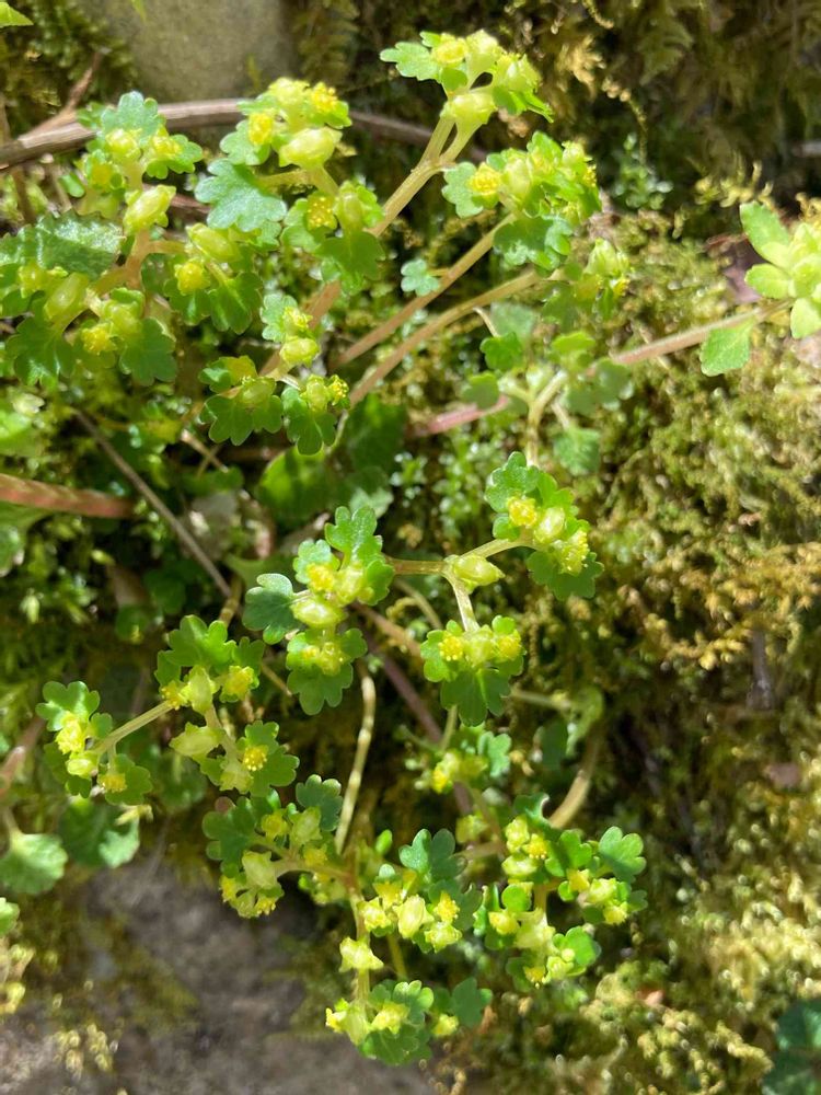 去年放置していたpicもネコノメソウ属であることが今判明❣️ツルネコノメソウという子です。黄色い極小のお花。文字通り茎がツルのように長く伸びます。拡大すると8本の雄しべの先に黄色の葯がみえます。茎葉は互生。
