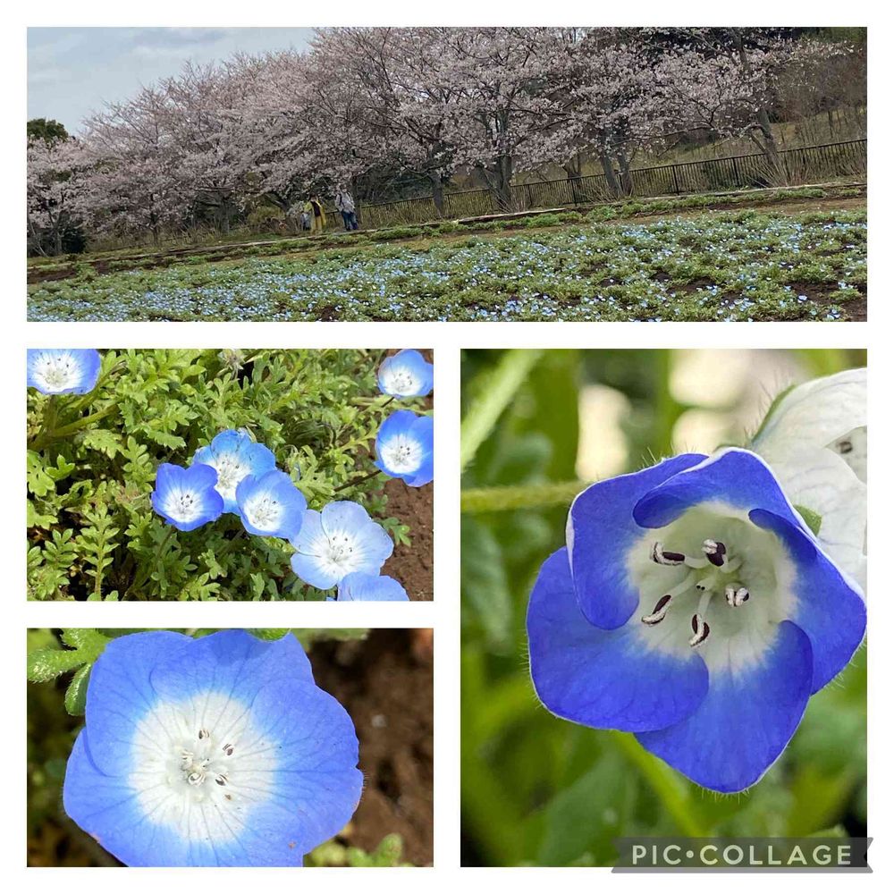 ネモフィラと🌸のコラボ珍しいね〜✨ネモフィラの青も濃いのもあるんだねー綺麗〜