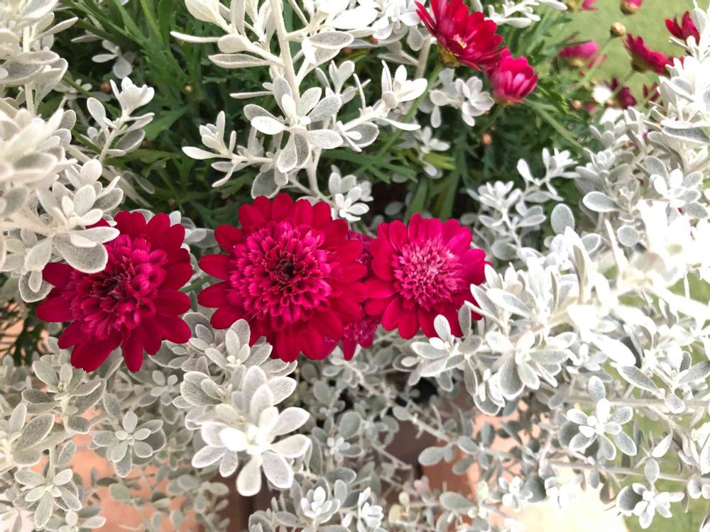 オレアリアのシルバーリーフに赤に近いマゼンダの色がハッとする美しさですね♡