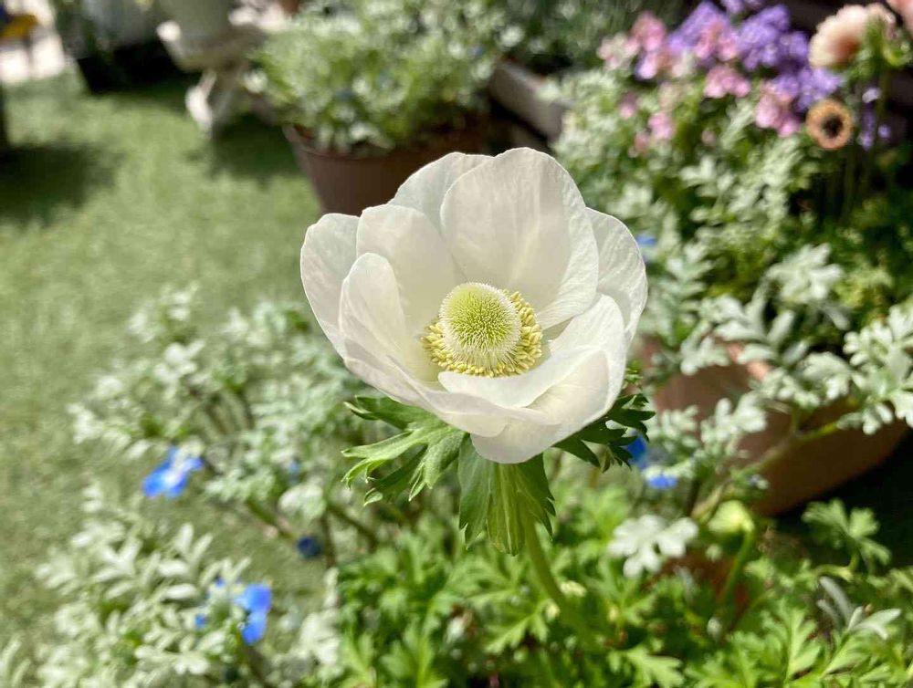 咲き始めの白いアネモネは中心がふわふわグリーン💚