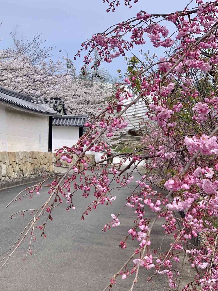 枝垂れ桜さん💕白い塀とピンクの花が、とても情緒がありました。京都 勧修寺参道