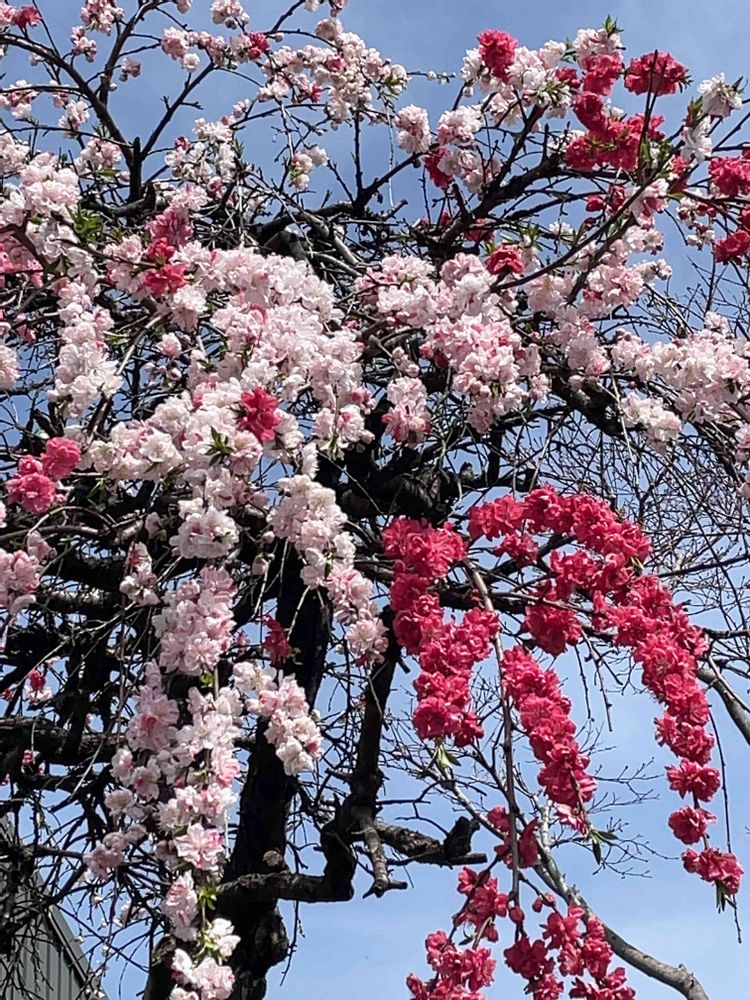 一本の木に白、紅、紅白と三色の花が咲くゲンペイハナモモ(源平花桃)