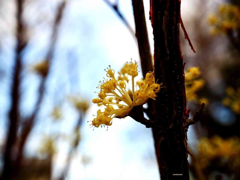 巷は🌸なのですが、春宣言花火を🎇可愛くアピールしている、サンシュユさん🌼