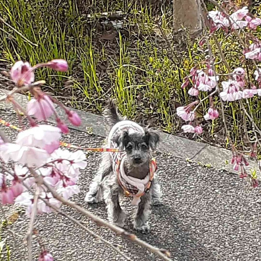 散歩道の枝垂れ桜と🐶