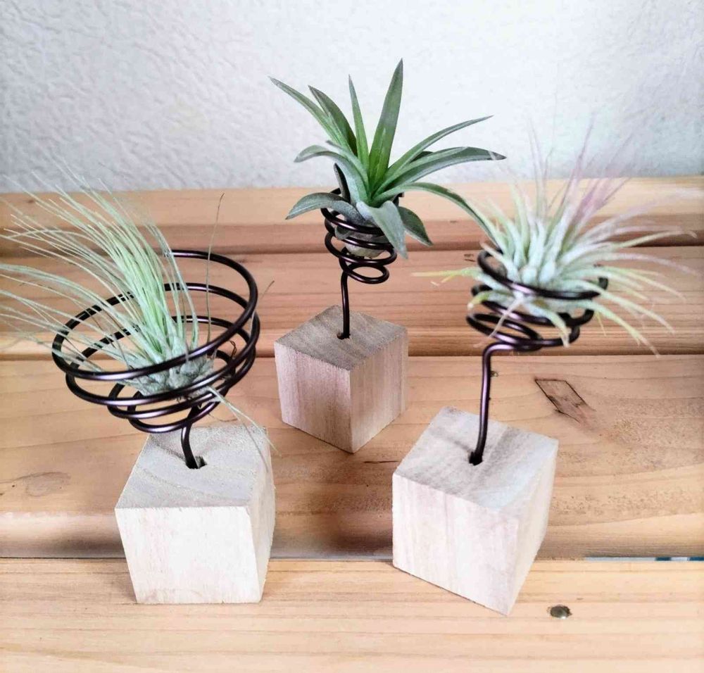 セリアのワイヤーと木材でエアプランツスタンドを作ってみました。木材に穴を開けてワイヤーを刺しただけですが可愛く飾れて大満足です。お財布的にもね😙
