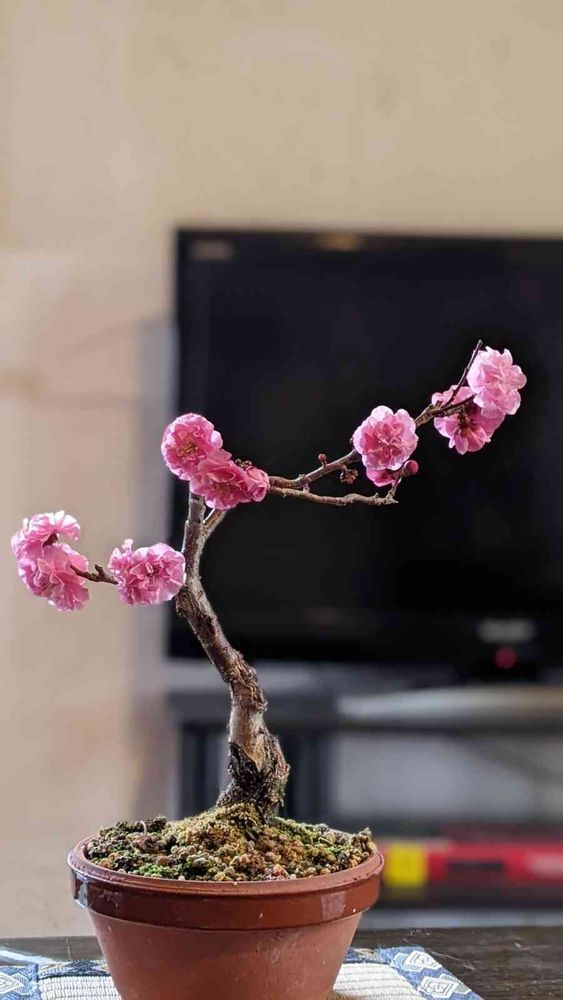 盆栽風の梅が奇麗に咲いたのでリビングに飾ってみました。旦那が盆栽にハマってた時に買ったものなんですが今は私が水だけあげてます。植え替えは秋かな。ひと回り大きい鉢にしようかと思ったけど主人が言うには土だけかえて同じ鉢に戻した方が盆栽っぽく小さく育てられるみたいです。根は切ってもいいみたいなので秋にでも植え替えしてみます。