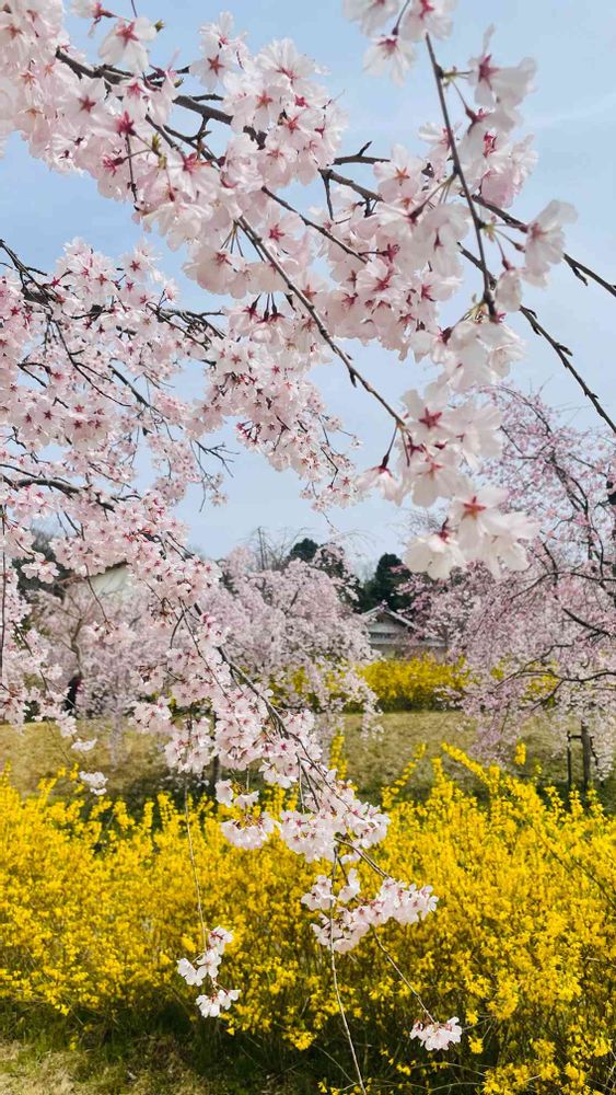 加古川市八幡神社の枝垂れ桜とレンギョウ🌸
