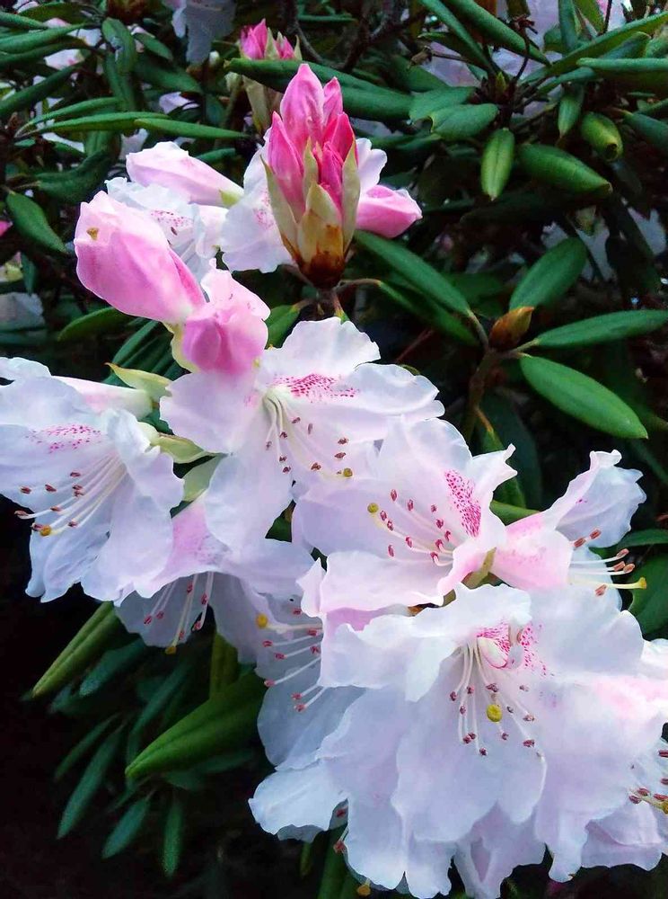 白い花びらに薄いピンクがチラホラと見えて柔らかな雰囲気がなんとも素敵なシャクナゲですね。