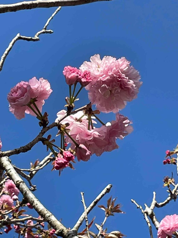 快晴の空に、ピンクの八重桜🌼綺麗やね🎵