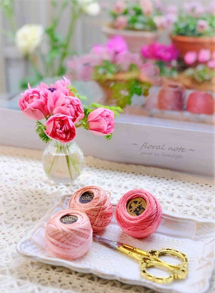 アンアリスとお母様の刺繍糸、後ろのお花達と、色んな色のピンク🥰