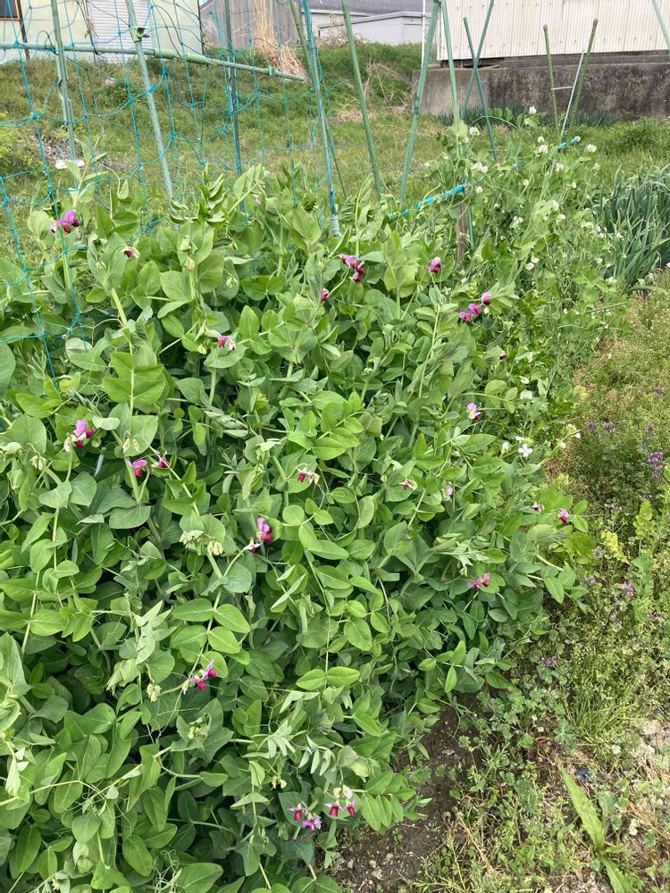 葉ばかり茂っていた絹さやにもようやく花が咲き始めました。