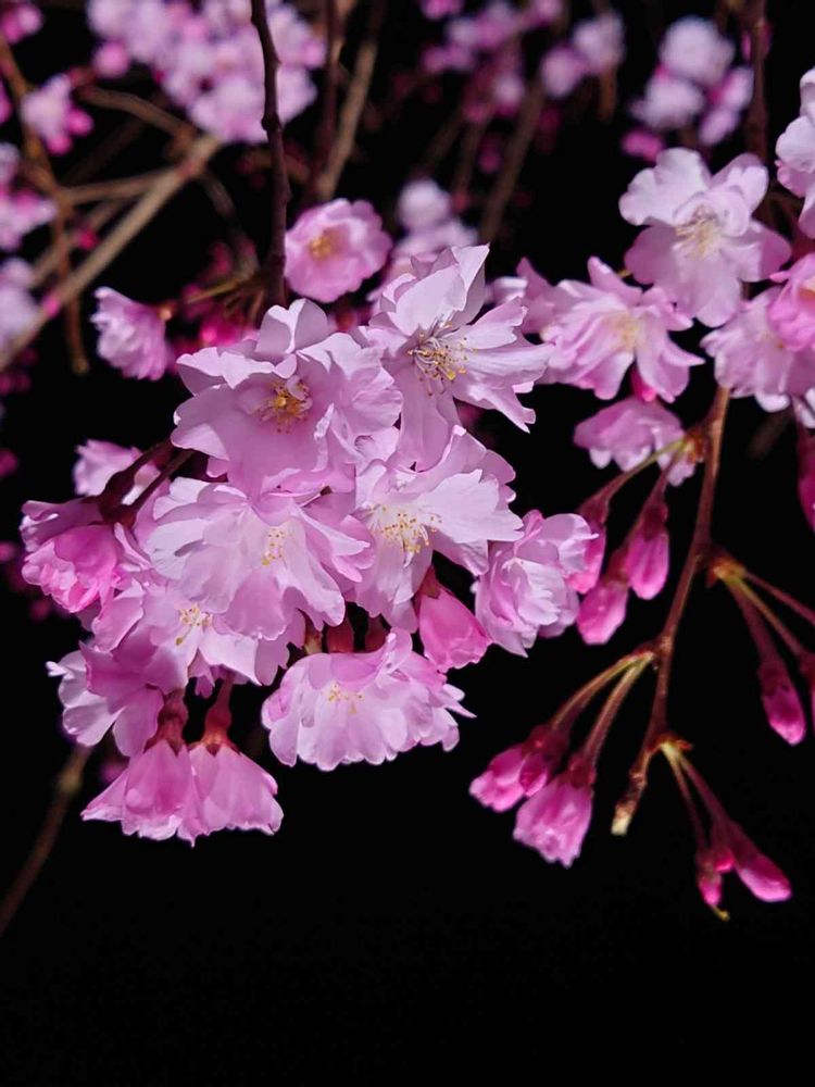 夜桜 ライトアップの枝垂れ桜をアップで🌸