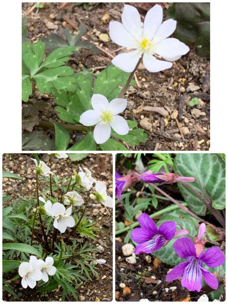 ニリンソウと肥後スミレ・源氏スミレ、珍しくて綺麗なお花ですね😍💜🤍🌿
