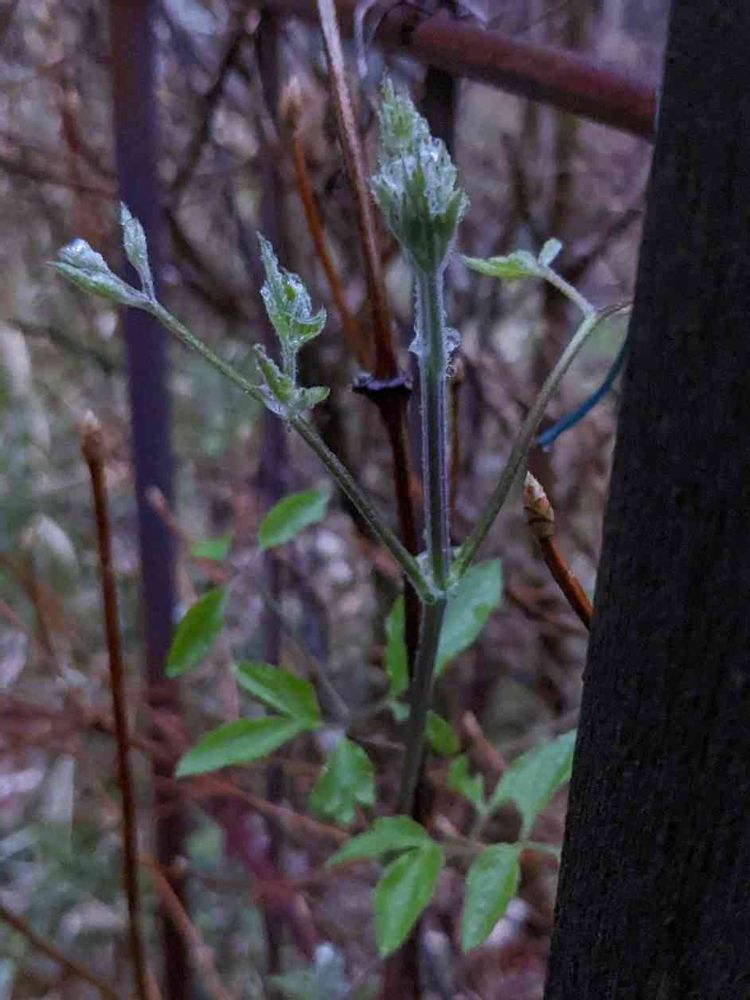 昨日夕方 ドッグランの外側のアーチの藤色のクレマチスの力強い新葉に 楽しみな蕾もついていました…