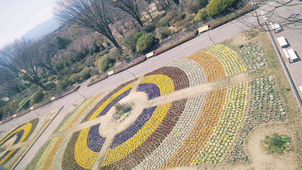群馬フラワーパークの展望台からのパンジーの植え込み🌼