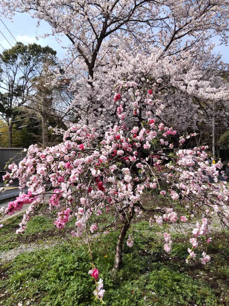 桜をバックに枝垂れた枝に咲くのは、梅?桜?桃?なのでしょうか❔