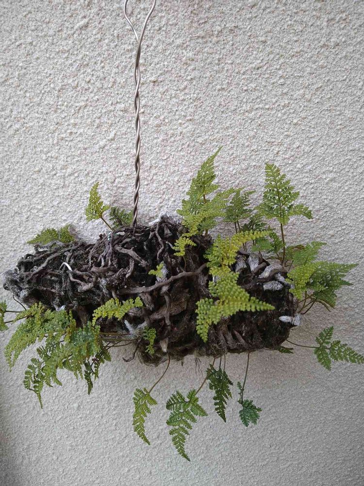 リナリアさんのつりしのぶは縦にぶら下げてもいいかも。