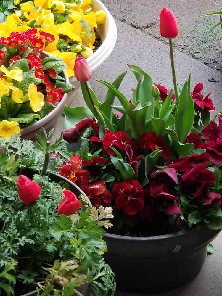 赤いチューリップとビオラの寄せ植えいいね😃🌸🌿