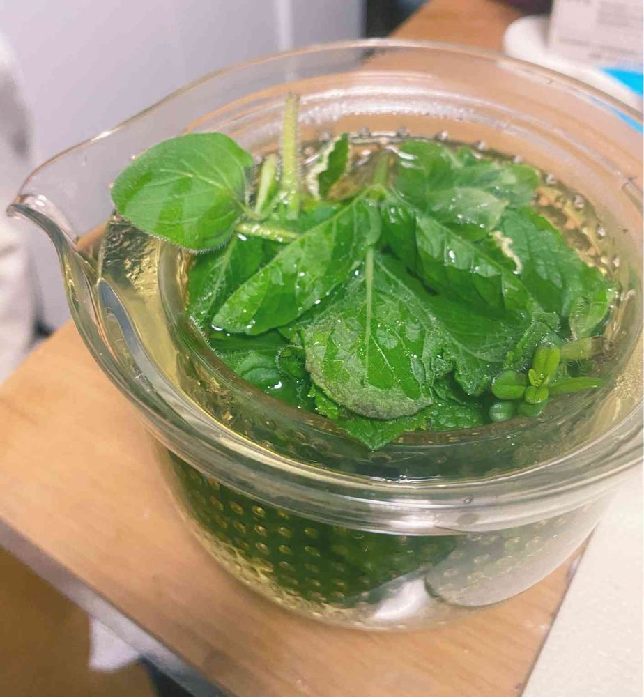玄関先に沢山育ててるのを摘んで来て、洗ってポットに入れて、熱湯を注ぐ。