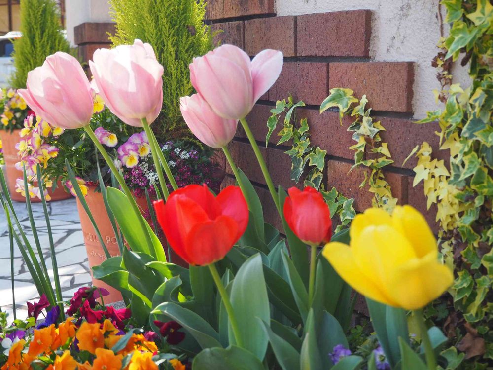 ピンク 赤 黄色の順で咲いています🌷
