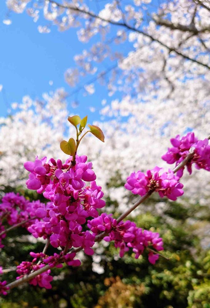 ハナズオウと桜満開のコラボです❗🌸🌸😊