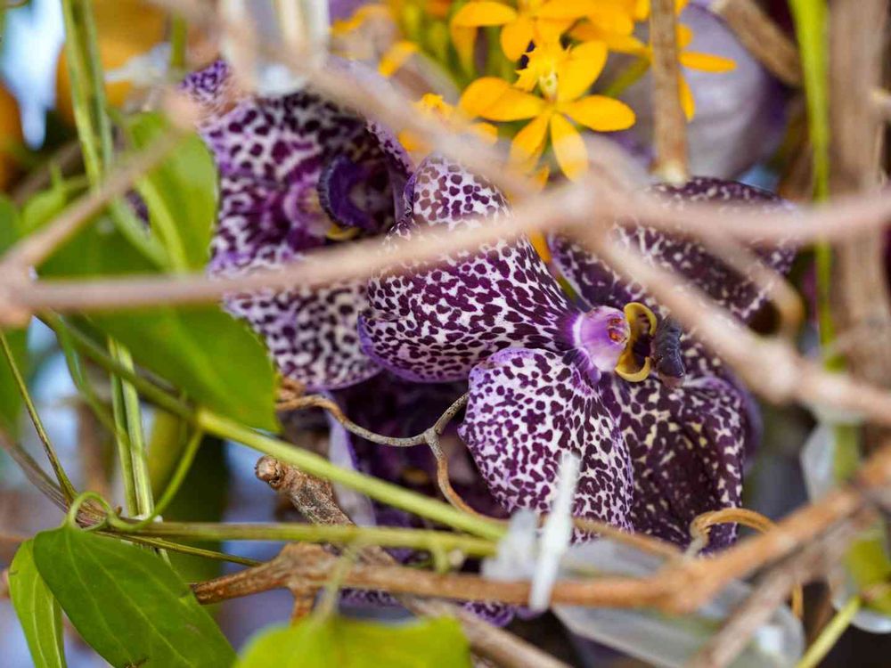 このアレンジメントは。蔓を編んだ中にバンダやパフィオ、胡蝶蘭か飾られているの。すごいよ。