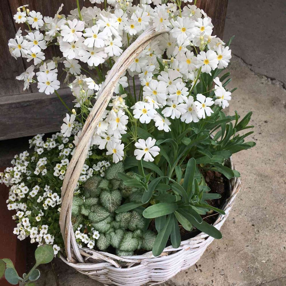白いカゴに、白い寄せ植え🤗モリモリ!もうすぐオンファロデスも咲くんだけど…もう満員ですね😵