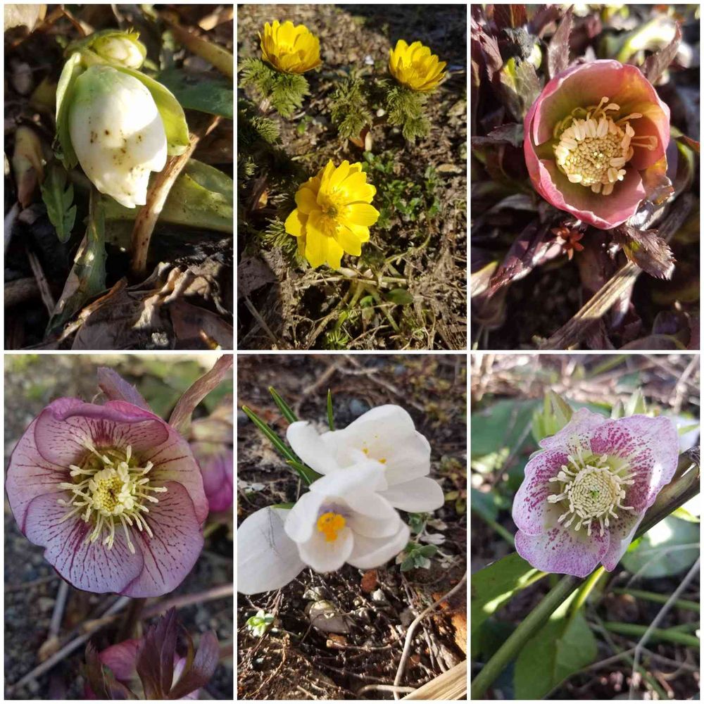 真ん中黄色は 母が残した福寿草。盆栽の鉢から庭に移植。