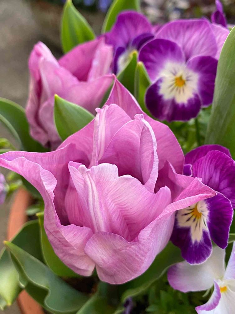 チューリップ💜🌷と種まきビオラ💜🌱の寄せ植えのチューリップが可愛いく咲いてくれました💜💕💜💕