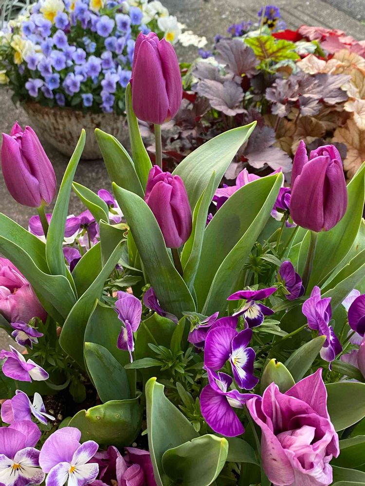 背の高いチューリップ💜🌷は明日、開花するかしら? 5球とも蕾が立ち上がって来ました。一本だけ短く不揃いですが。