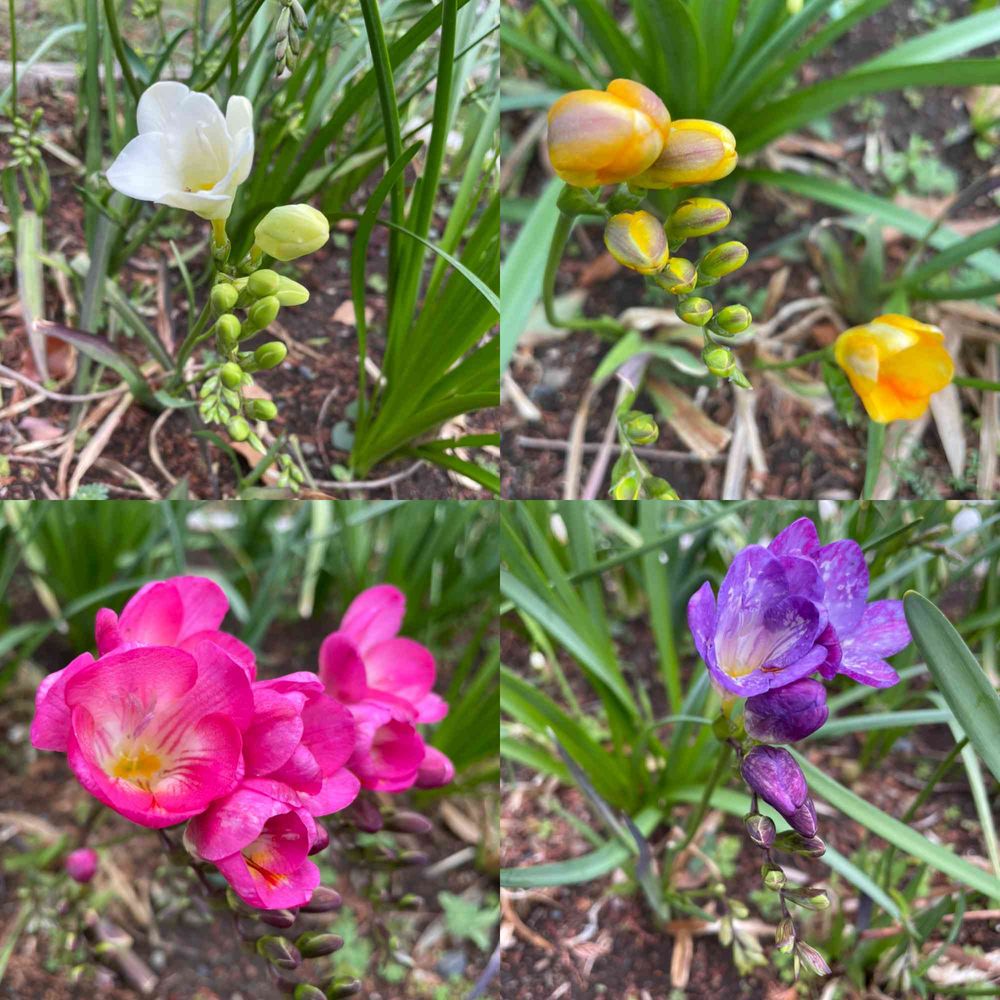 フリージアの白と黄色は花屋さんでよく見かけるけれども、公園の花壇に濃いピンクと紫色も咲いてました🥰
