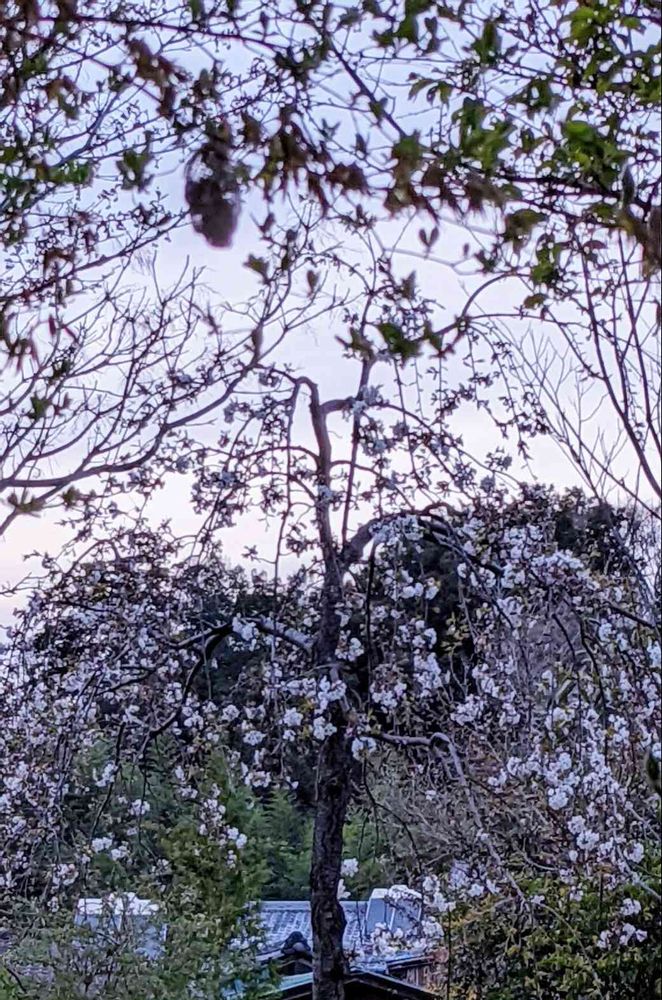 昨日夕方 こちらの木々の向こうに枝垂れ桜が大分咲いて来ています