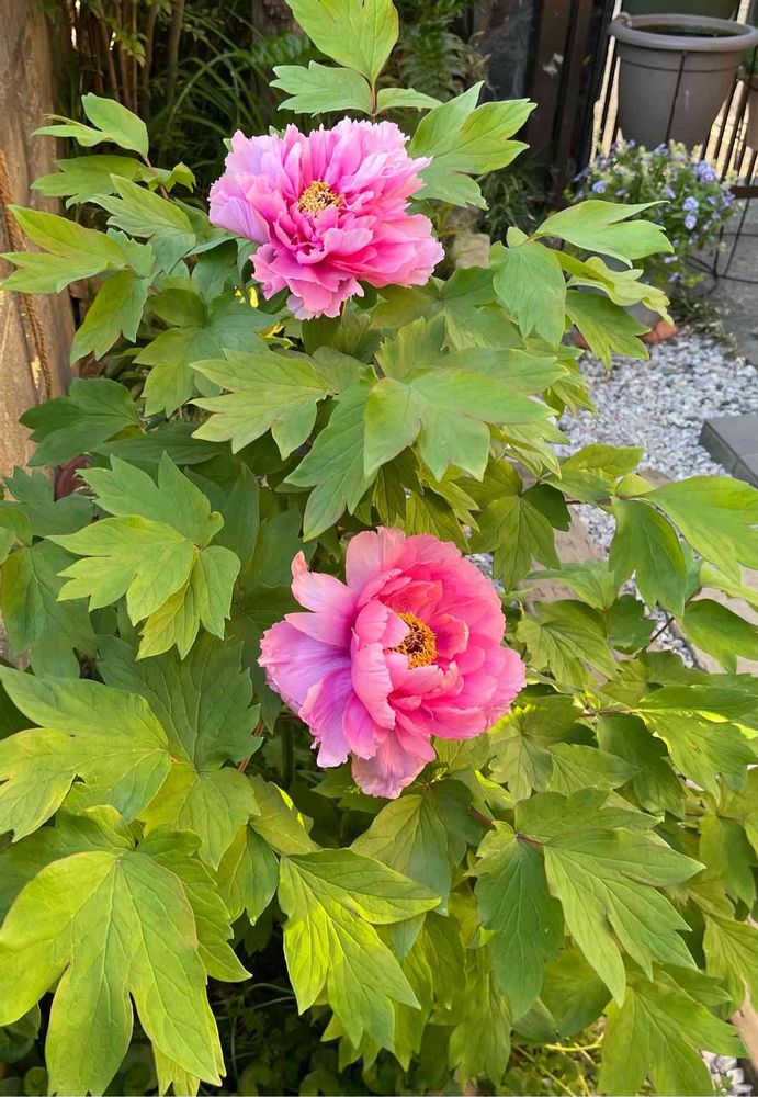 父が育てていた牡丹。今年は二輪が咲きました☺️例年より少ないのは、陽当たり?気温?肥料?の関係だろうか…葉っぱは多すぎな感じです。😄