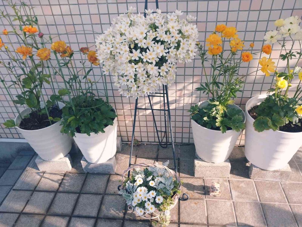 下の方にマーガレットホワイトモカのバスケット植え🌼