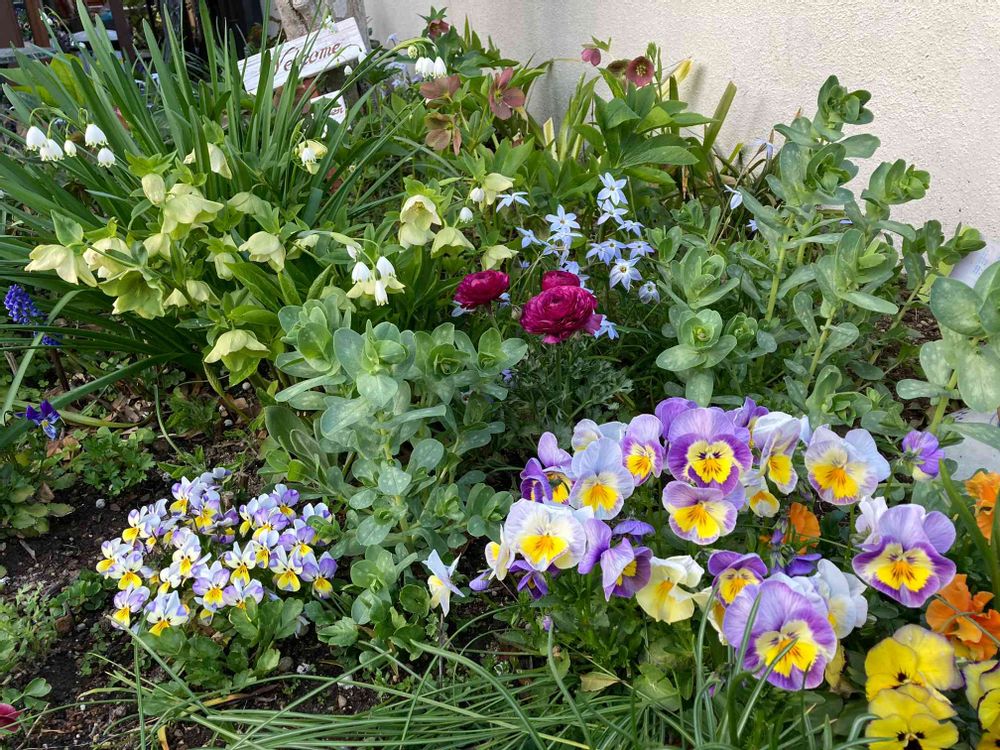 早春はクリスマスローズに、今はラナンキュラスやセレシオに頑張って貰っています。1番頑張っているのは、手前のパンビオです。