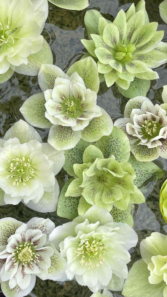 今年最後の花手水。白い花から黄緑、緑と色が変わっていく。クリスマスローズの魅力をもう一つ見つけました。