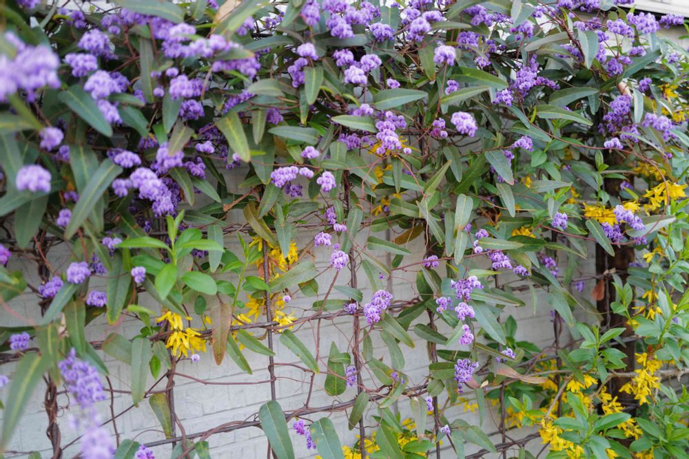 キッチンの窓の下には、ハーデンベルギアとレンギョウを誘引しています。