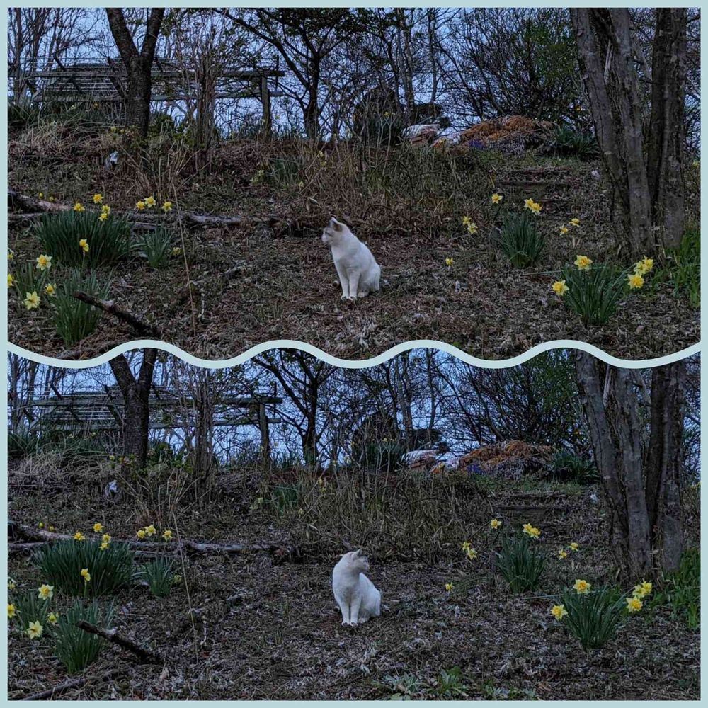 「ママちゃん 右も左も黄色いスイセンさん いっぱいだね〜」…庭パト助手チロも喜んでいます