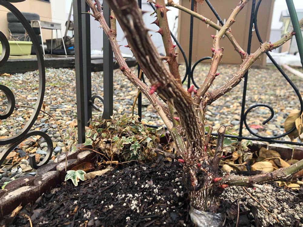 それでも薔薇は強い🌹赤く色付いた芽がニョキニョキ🌱
