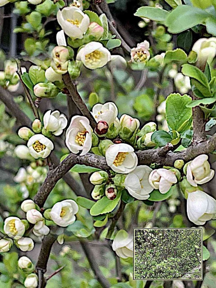 カタバミさんのお出かけ先,ボケ(木瓜),/白と紅まだらの、勢いよく春呼び込む花木/の投稿画像