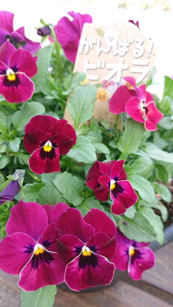ラベルの「がんばる!」が可愛すぎて名前買いしたローズ色のビオラ