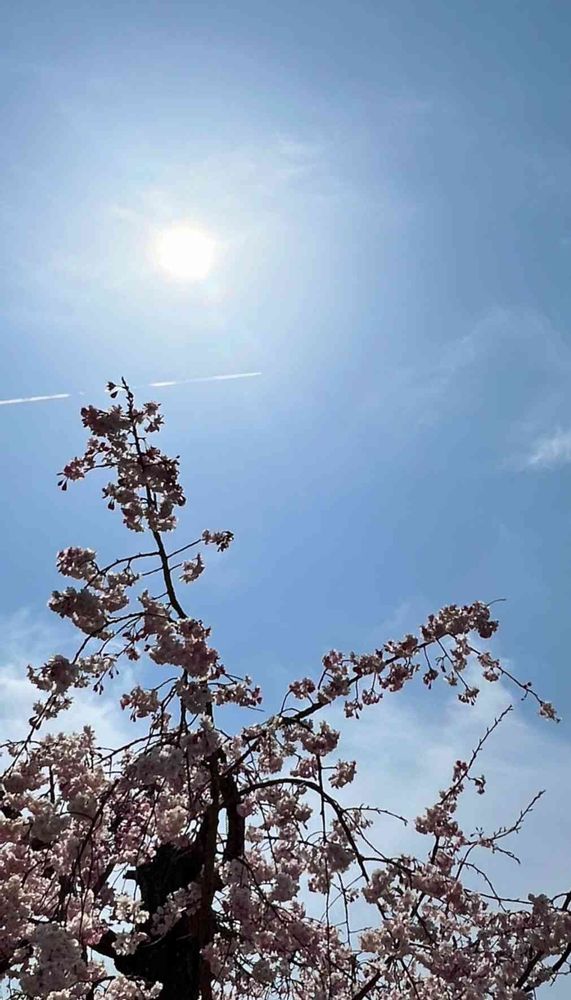 春陽を浴びて咲く枝垂れ桜と太陽と