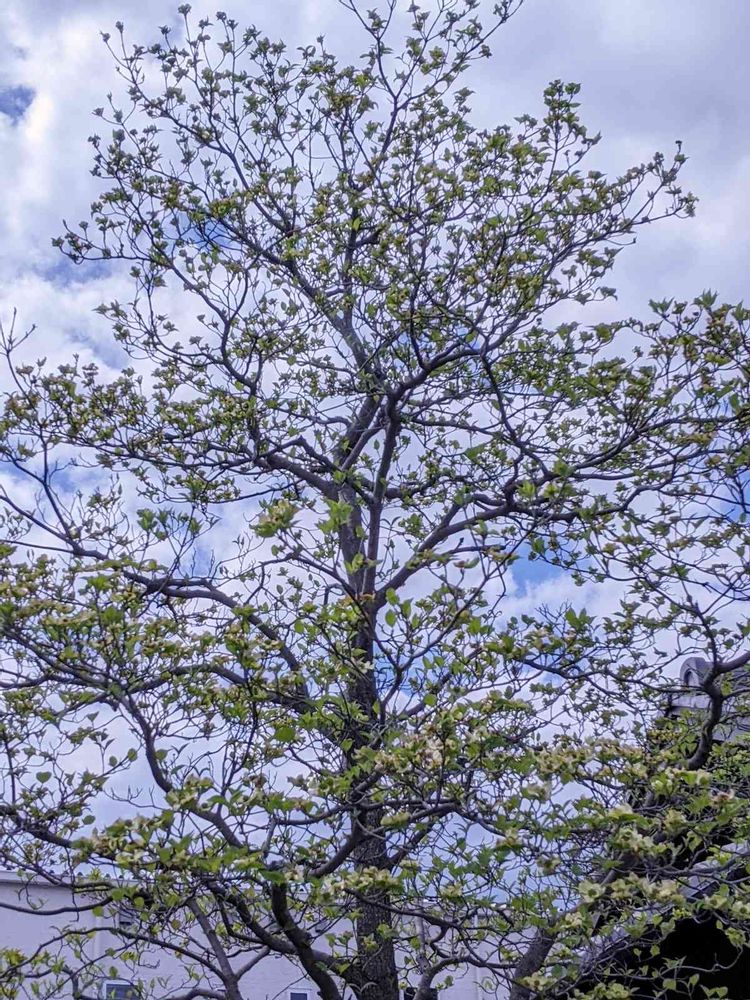いつもと違う路地を曲がると大きな白いハナミズキの木!…圧倒されますね〜 もう咲き進んで葉っぱが出ている…?🤍🌿🤍🌿🤍