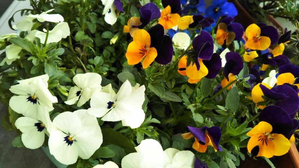 ビオラがのびのびだったので😄仮詰めましたら混盛と咲いてくれたよ💜🧡🤍💞