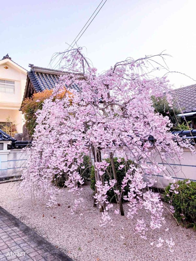 仕事帰りに、幼い頃遊んだ竜泉寺に、立ち寄りましたら、先日迄は蕾だった枝垂れ桜🌸が満開に、成っていました。