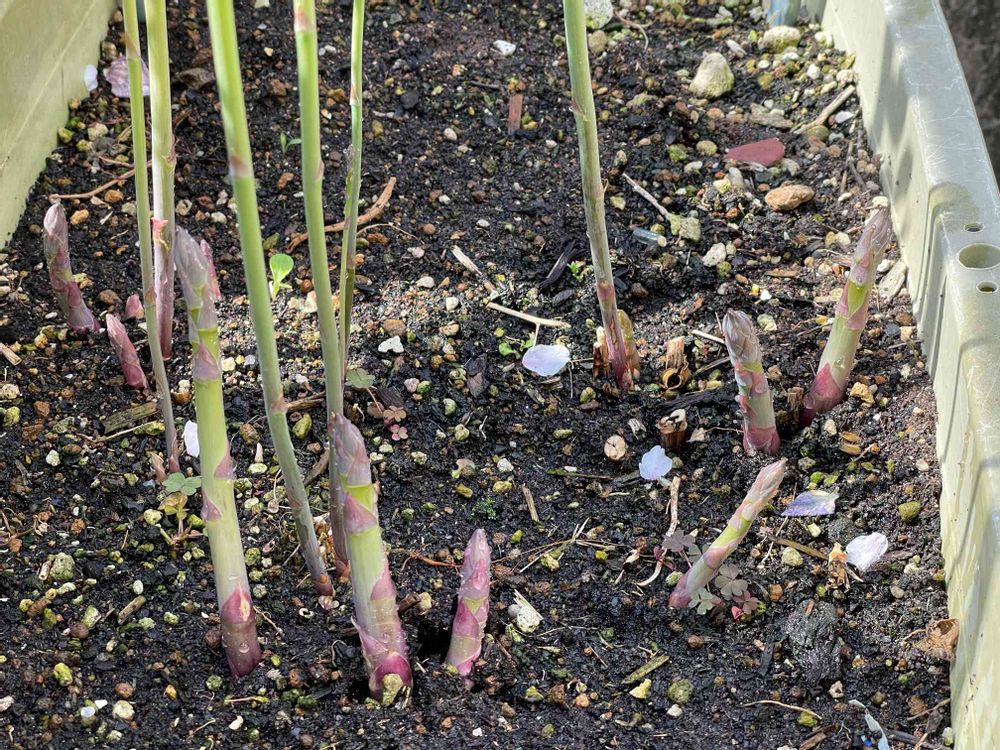 『1年目、2年目は収穫をせずに株を生長させ、3年目の春に出た芽から収穫を始めます。その後、10年ほど収穫が可能です。』という事ですが、うちはプランター(65×35×25)で育てているのでなかなかたくさん収穫できません😅